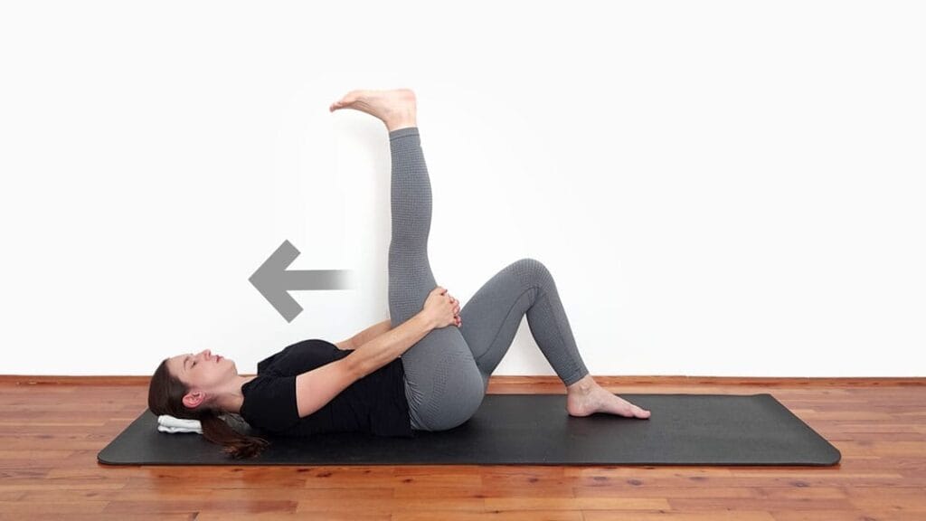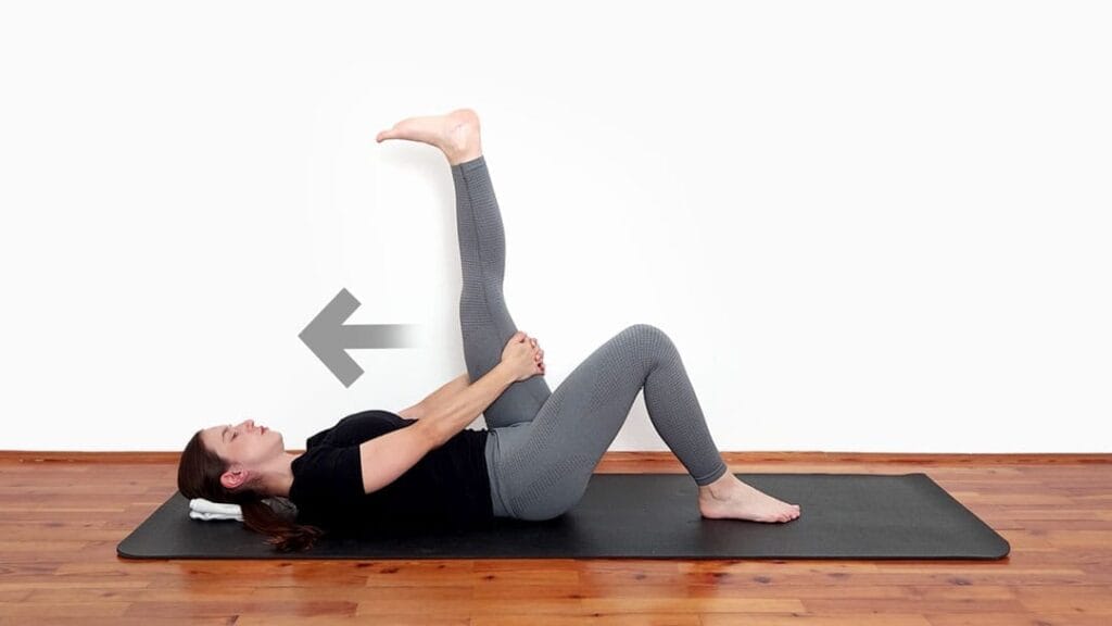 Przyciąganie kolana do klatki piersiowej pomaga rozluźnić dolną część pleców, zwiększa elastyczność bioder i łagodzi napięcie mięśniowe.