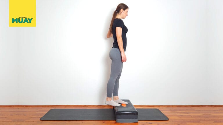 Proste rozciąganie ścięgna Achillesa na stopniu, aby złagodzić napięte łydki, poprawić ruchomość kostki i wspierać odporność ścięgna.